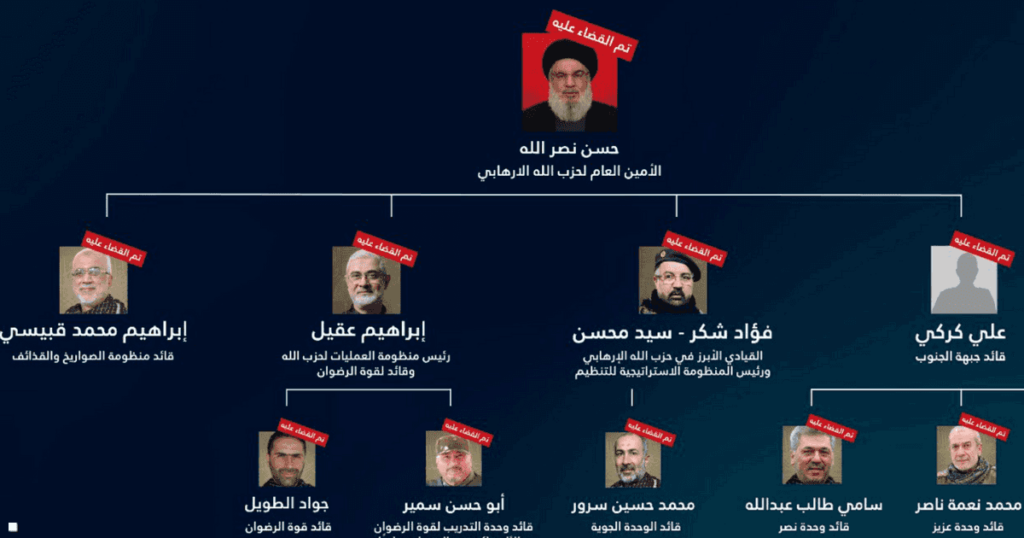 واستعرض حساب “إسرائيل” التابع لوزارة الخارجية على منصة “إكس” صور أبرز القادة الذين اغتالتهم إسرائيل على رأسهم الأمين العام للحزب حسن نصر الله، إلى جانب مسؤول جبهة الجنوب علي كركي إلى إبراهيم عقيل، قائد وحدة الرضوان، وفؤاد شكر الذي كان مسؤولا عن كافة عمليات الحزب الحربية، ووسام الطويل الذي تولى قبل عقيل وحدة الرضوان.