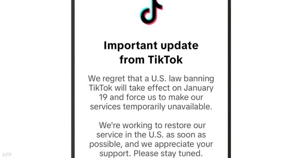 شاركها فيسبوك تويتر لينكدإن بينتيريست البريد الإلكتروني وإذا حاول المستخدمون الولوج إلى التطبيق، فسوف يجدون رسالة تقول إن القانون “أجبرنا على تعليق خدماتنا مؤقتا. نعمل على استعادة الخدمة في الولايات المتحدة في أقرب وقت ممكن”. quotتيك الصين. العمل المتحدة الولايات الولايات المتحدة توكquot تيك توك عن في يتوقف