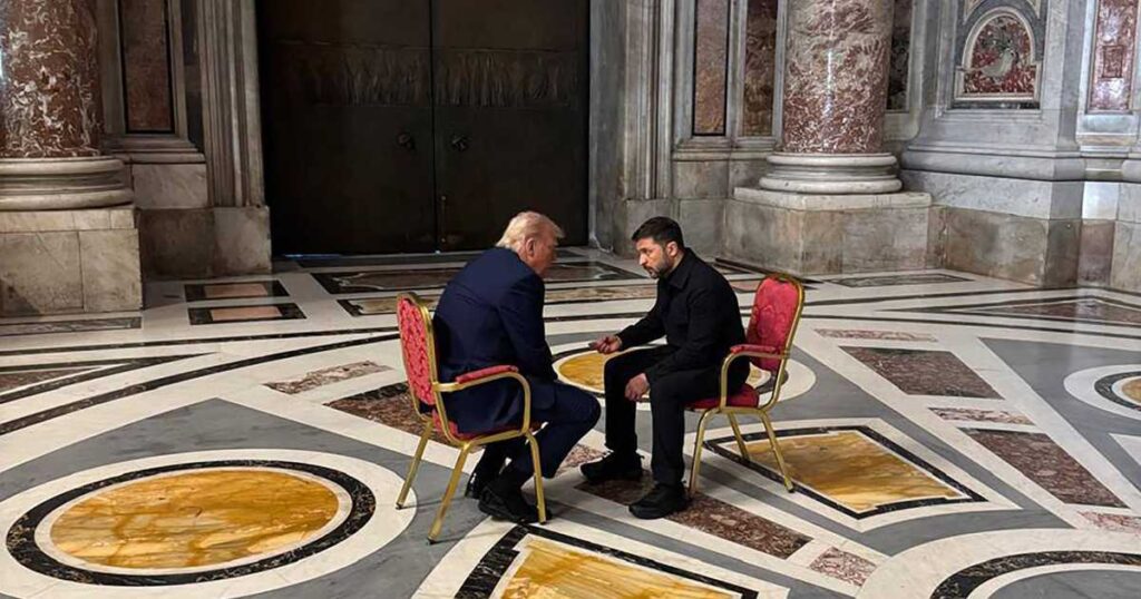 وقالت “تلغراف”: “شكّل مشهد جلوس زيلينسكي وترامب وجها لوجه في كاتدرائية القديس بطرس إحدى أكثر اللقاءات غرابة للحرب الجارية، بل وللسياسة العالمية رفيعة المستوى، منذ سنوات”.