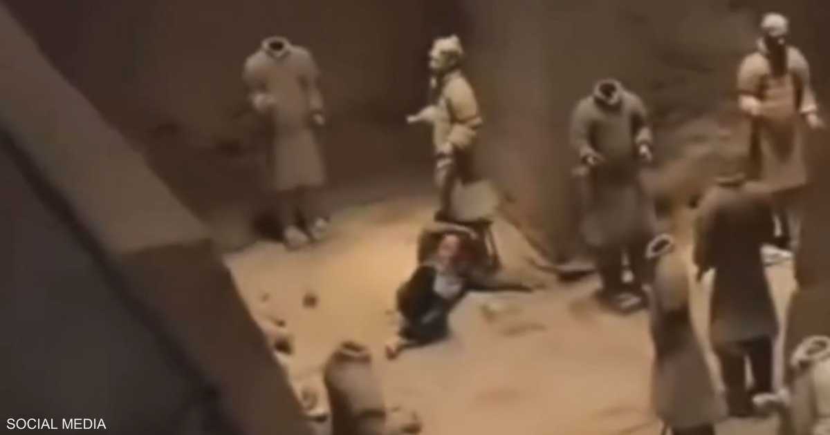 وقبل “السيطرة عليه”، عمد الرجل إلى “دفع وسحب” تماثيل المحاربين الطينيين وألحق أضرارا بتمثالين.
