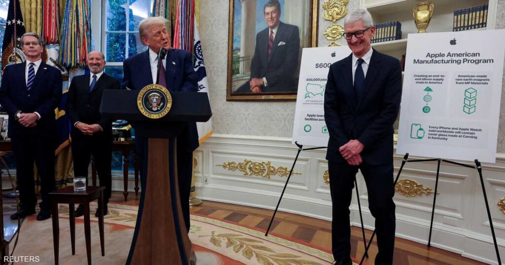 وأعلن تيم كوك، رئيس شركة آبل، في المكتب البيضاوي برفقة ترامب: “نلتزم اليوم باستثمار 100 مليار دولار إضافية في الولايات المتحدة، ليصل إجمالي استثماراتنا في الولايات المتحدة إلى 600 مليار دولار على مدى السنوات الأربع المقبلة”.