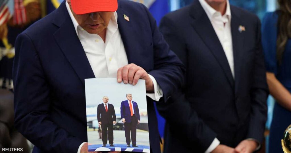 وعرض ترامب صورة له مع بوتين التقطت خلال لقائهما في ألاسكا، موضحا أن الرئيس الروسي أرسلها إليه، وقال : “سأوقعها له”.