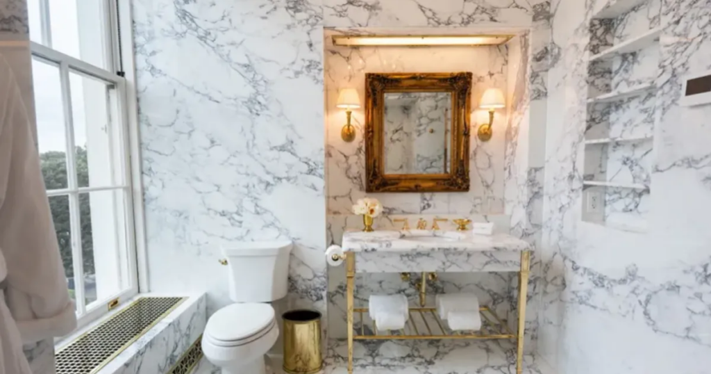 وتُظهر الصور حمّاما فخما بتجهيزات ذهبية، بينها رأس دش وصنابير بلون ذهبي، مقابل جدران وأرضية من الرخام الأبيض الممزوج بخطوط رمادية.