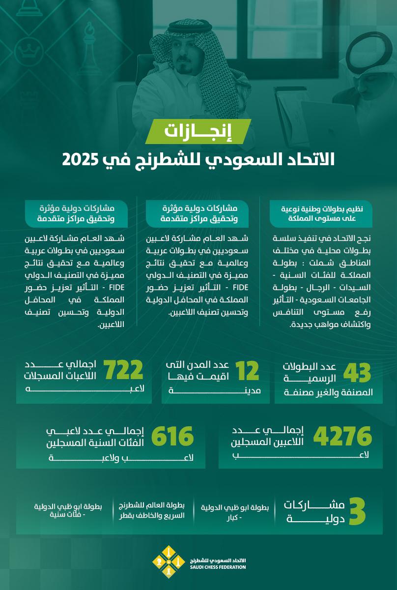 شهد عام 2025 قفزة كبيرة للعبة الشطرنج في المملكة، بجهود مواصلة من الاتحاد السعودي للعبة برئاسة محمد بن مطلق المسعودي، حيث حقق الاتحاد السعودي خطوات ملموسة على كافة الأصعدة سواء من حيث توسيع قاعدة المشاركة لتشمل مختلف الفئات، أو على الصعيد الدولي بتواجد بارز ومؤثر على خارطة اللعبة إقليميًا وعالميًا.